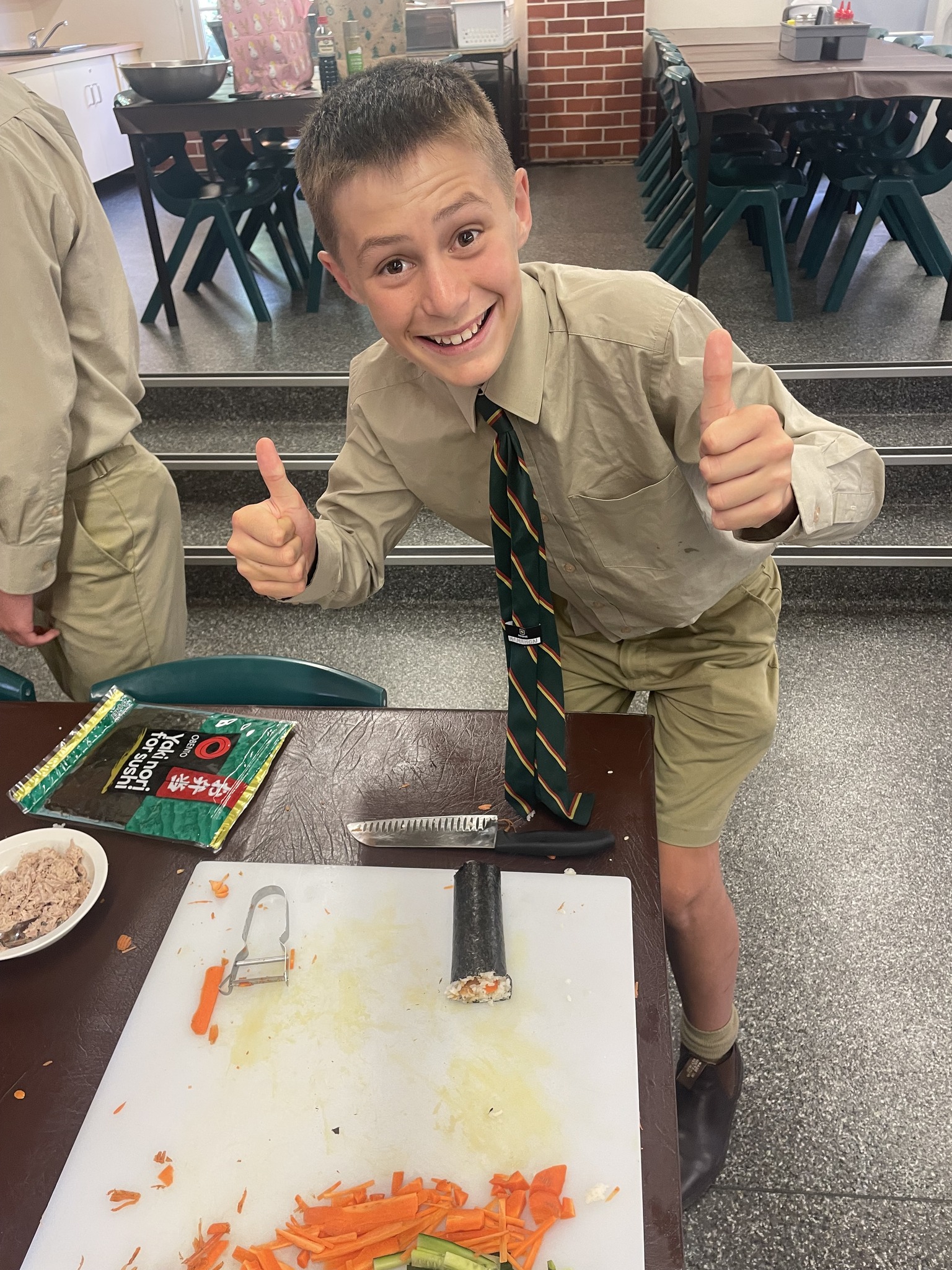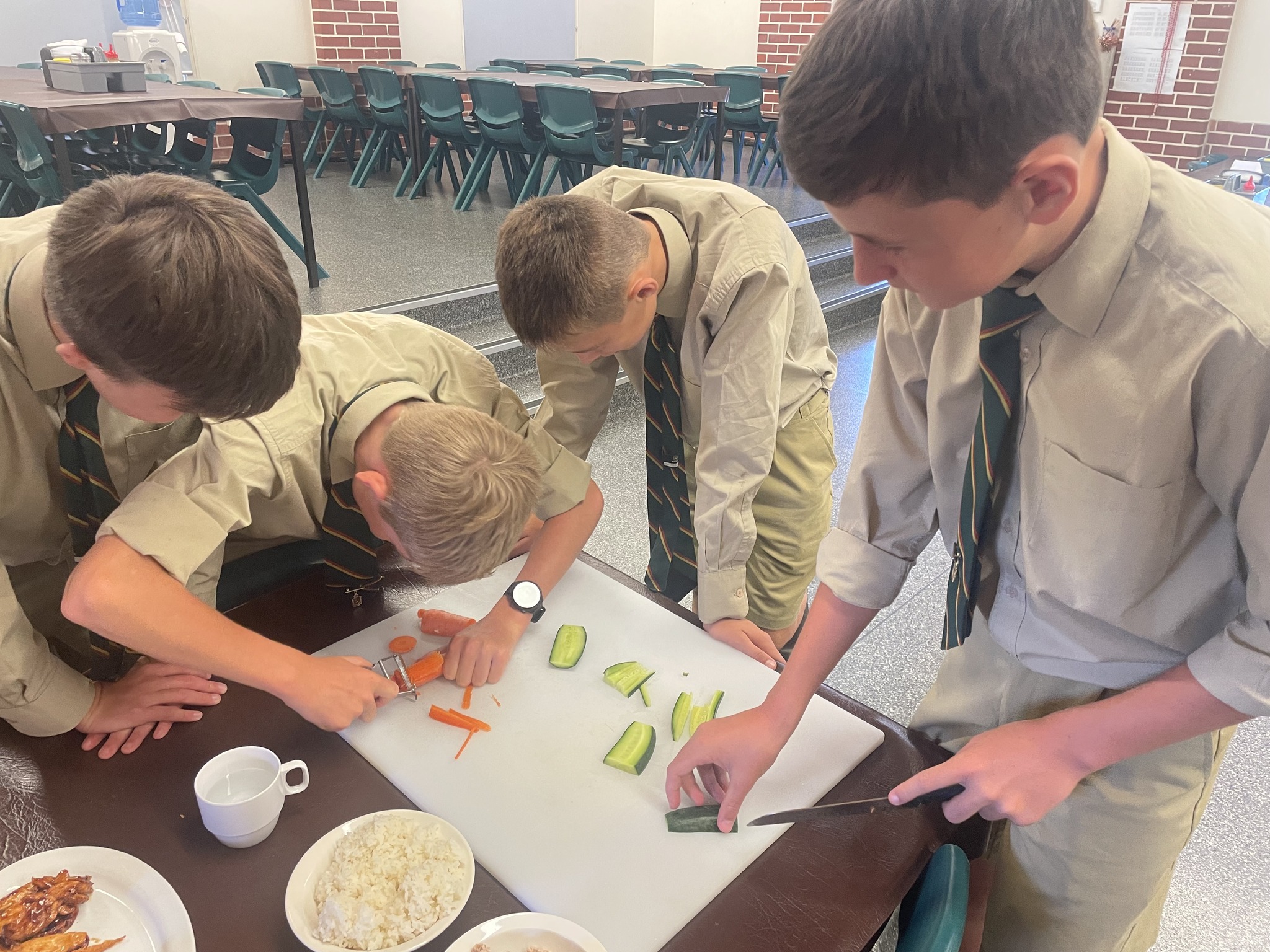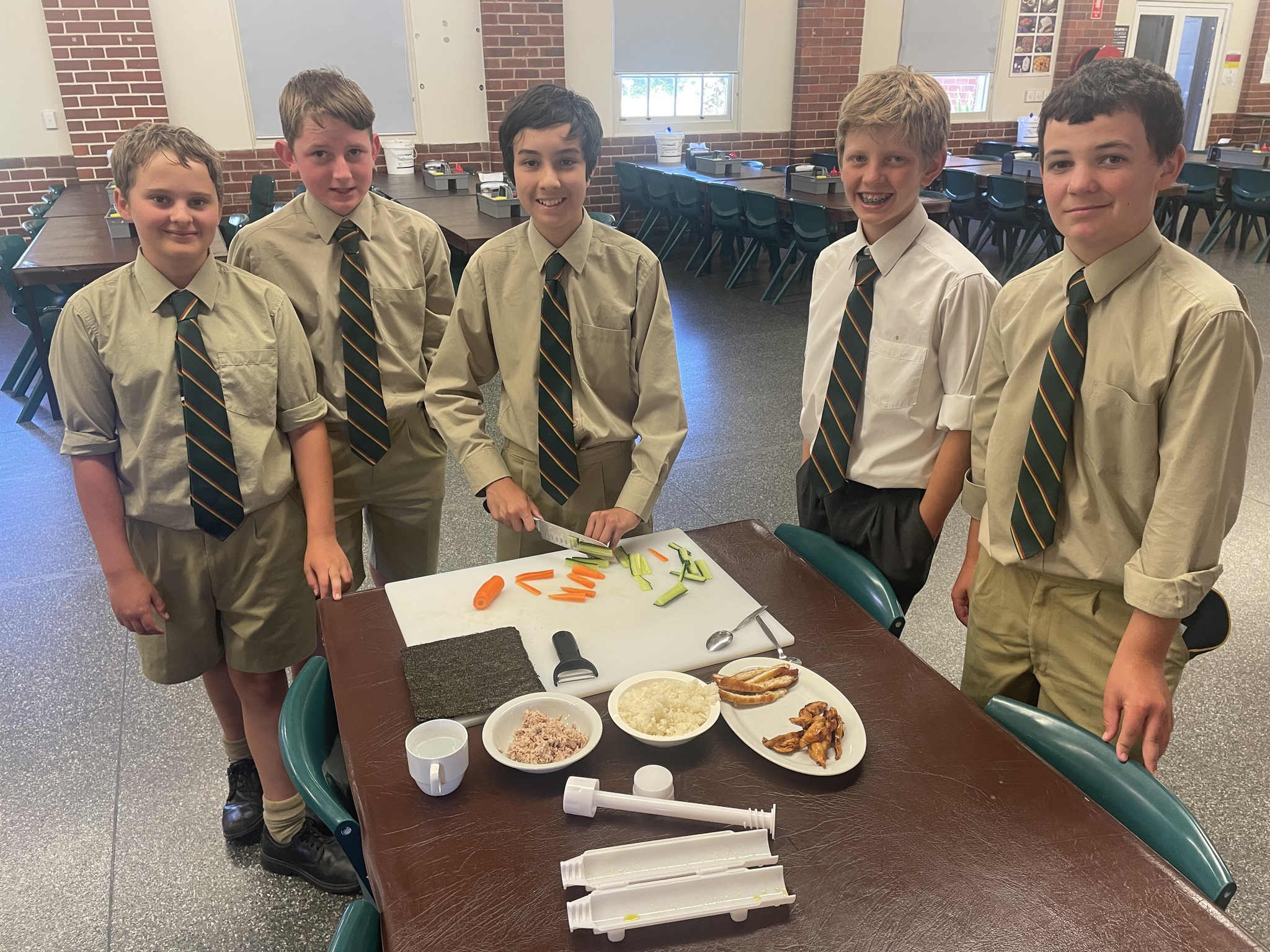 Students in Year 7 History have been learning about Japan under the Shoguns. 7HISW class were joined by Mrs Gasson and Mr Redman to make sushi. Mrs Gasson completed a student exchange to Japan and has visited many times, and was very happy to share her experiences and answer questions. She then showed the boys how to make delicious sushi, using a variety of ingredients including Katsu chicken, teriyaki chicken, tuna, kewpie mayonnaise, cucumber, carrot and of course seaweed and rice in their marvellous creations. Thanks to Mrs Gasson for sharing your skills and knowledge, Mr Redman for showing how it’s done, and our Fec staff for providing cooking assistance and the kitchen utensils.