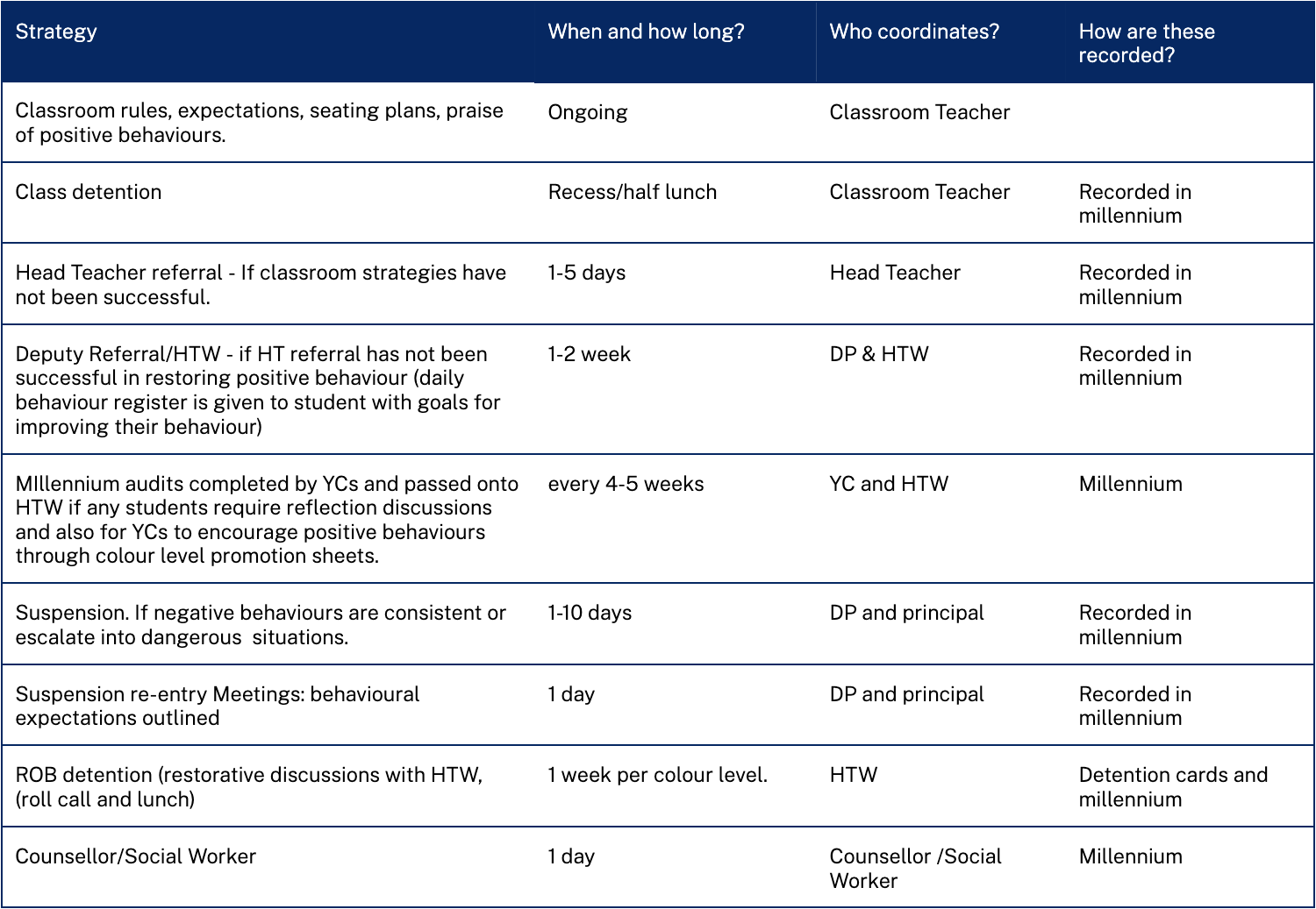 The following table outlines our school's approach across the continuum of prevention, early intervention, and targeted/individualised responses: